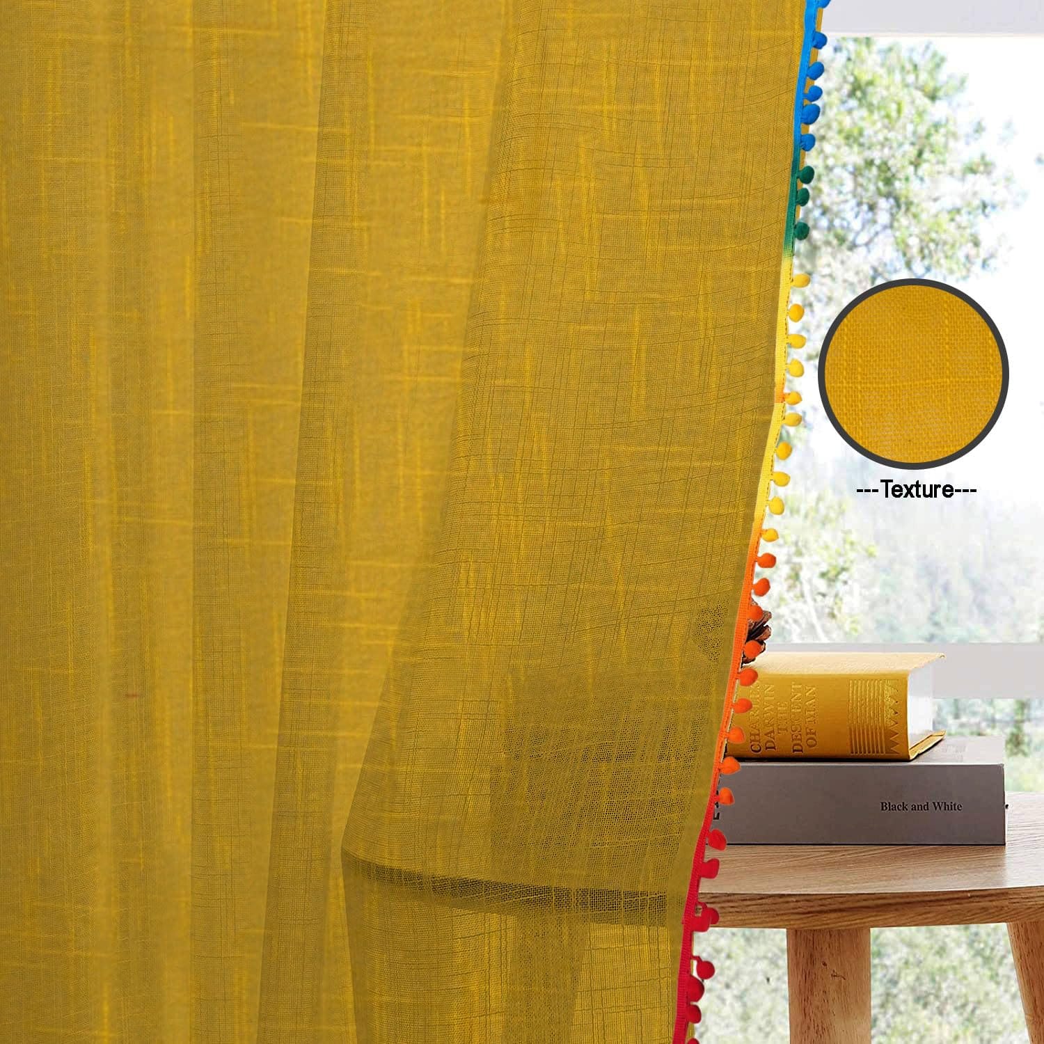 Seasons 7 Feet Door Curtains with Multicolor Pompoms, Mustard.