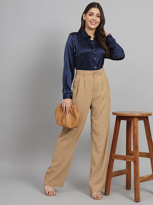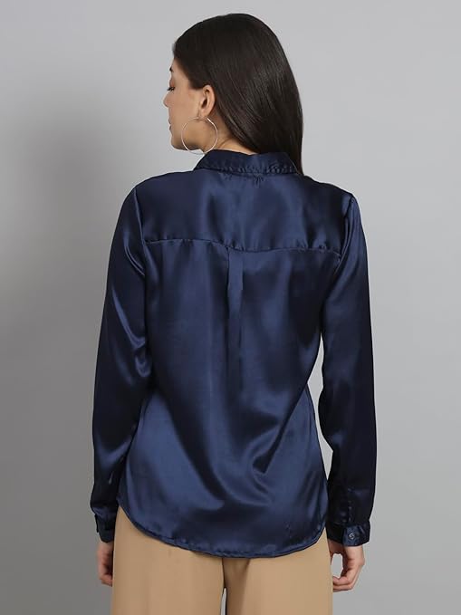 Women Formal Satin Navy Blue Shirt.
